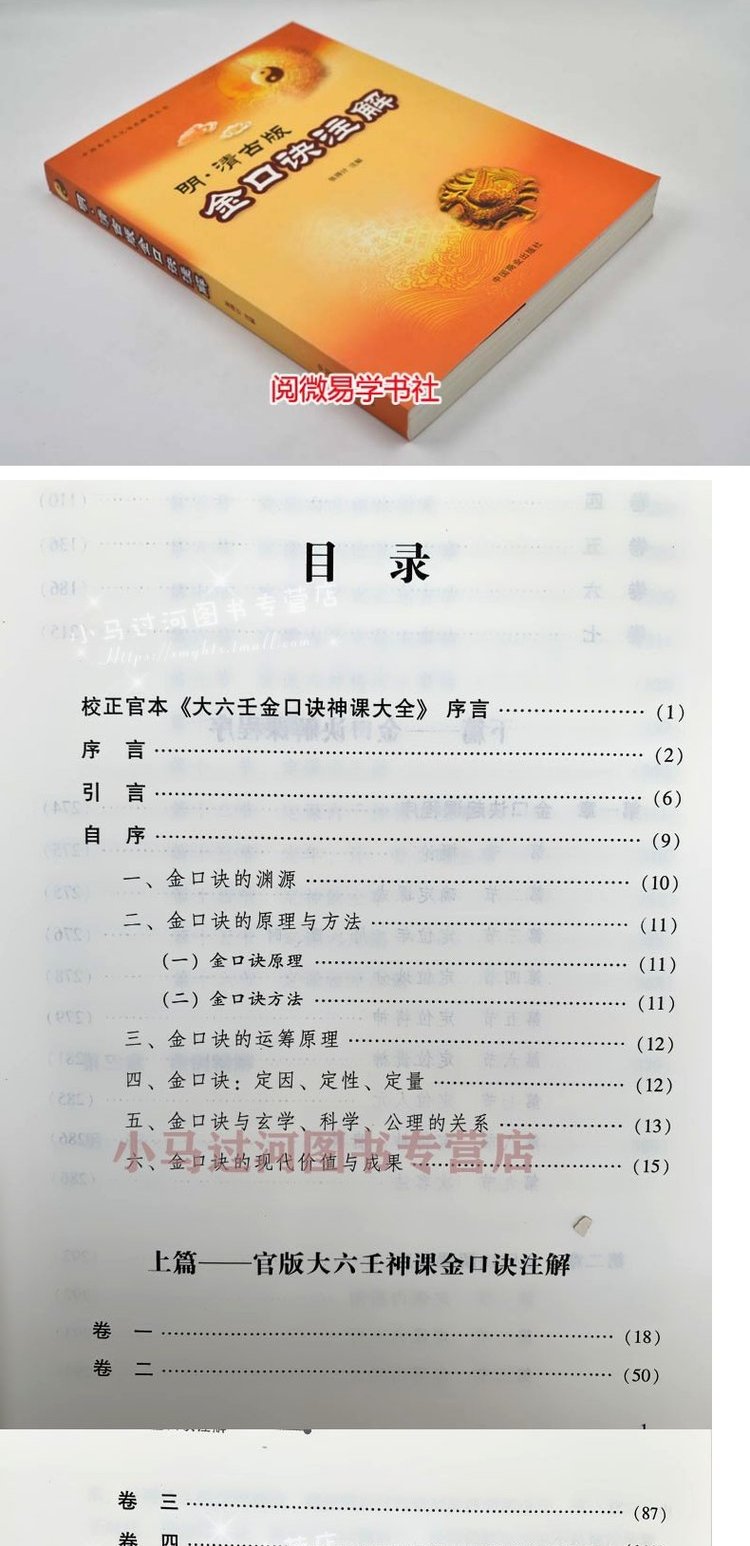 融太乙、奇門、六壬三式之精華的《大六壬神課金口訣》簡稱“金口訣”,是自古至今口口相傳的《孫子兵法》中“廟算”的絕秘精華,源於天人合一的理論,用此理論可以解析戰爭的勝負、人類及萬事萬物的興衰週期規律及人與人、人與物、人與事的相親、相愛、相和、相害、相刑、相騙、相爭、相鬥、相打等等錯綜複雜的關係,藉此方法能預知人生命運吉凶禍福即將發生應驗的時間點和空間方位,然後藉用相關方法給予補救和改變,使個人的命運、家庭的命運、企業的命運轉危為安、遇難成祥!古今受益者將此簡而精的預測體系稱為“知勝而戰”的法寶,此法更是“知己知彼,百戰不殆”運籌決策的金鑰匙!張得計註解的《明·清古版金口訣註解》是在金口訣傳人呂鴻雁先師所傳古本《明清官版大六壬神課金口訣大全》原文基礎上進行校訂、修正、註解而成,將生澀難懂的口訣及借物言像的理論、藏而不露的秘法以及呂鴻雁師父口傳心授的絕秘口訣進行白話解析、註解,填補了世間所傳金口訣的錯訛、遺漏、繁雜之不足,增補了本人三十多年來的部分心得、經驗與實戰案例。