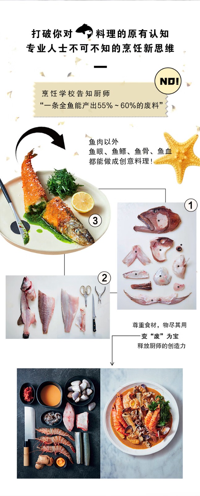 4.變“廢”為寶的可持續性觀念:“一條全魚能產出55%~60%的廢料”幾乎是全球公認的數據,作者卻不這麼認為。作者的烹飪理念是物盡其用,考慮魚身上那些一般被視為“廢料”的部位,不管是魚血、魚雜還是魚骨,只要烹飪方法對了也能成為一道佳餚。只烹飪魚片會限制廚師的創造力,還會忽視魚體內大部分寶貝,另外,烹飪全魚才能表現出烹飪者對稀有海產品的尊重。