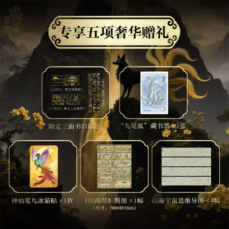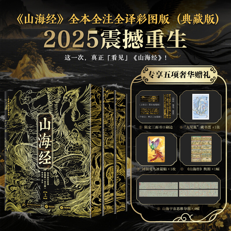 5以藝術畫冊的標準打造顛覆傳統的《山海經》,一套三冊全部硬殼精裝,禮贈顯品位!內頁使用仿古藝術紙,模擬古籍手感,隨書附贈11張《山系復原輿圖》+《華夏世系表》+32頁《神話思維導圖》,既是知識寶藏,也是藝術品級藏書!