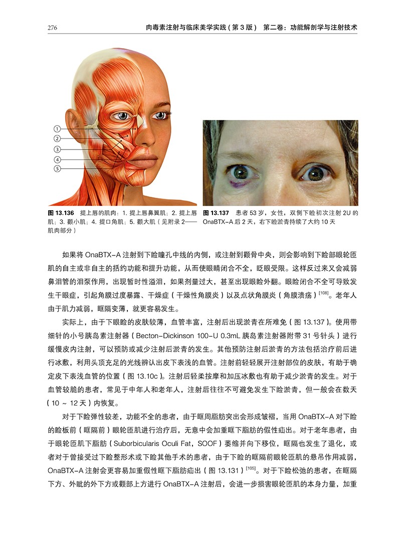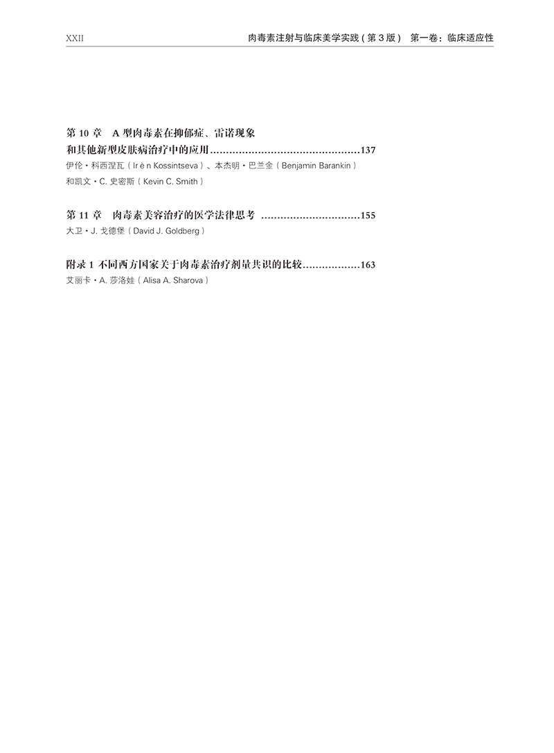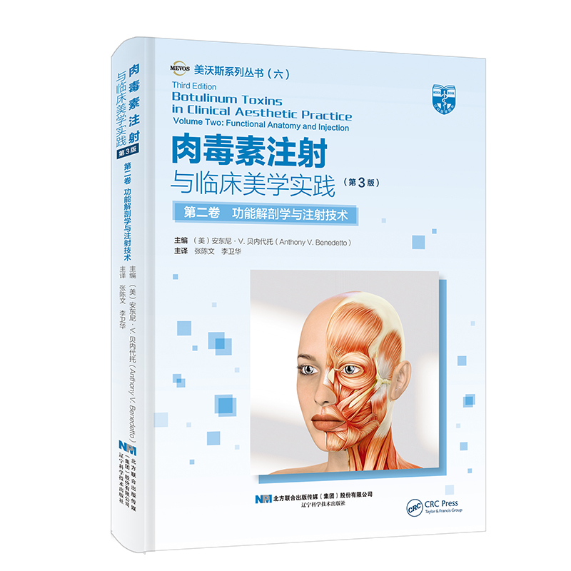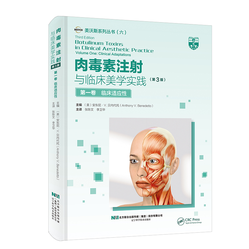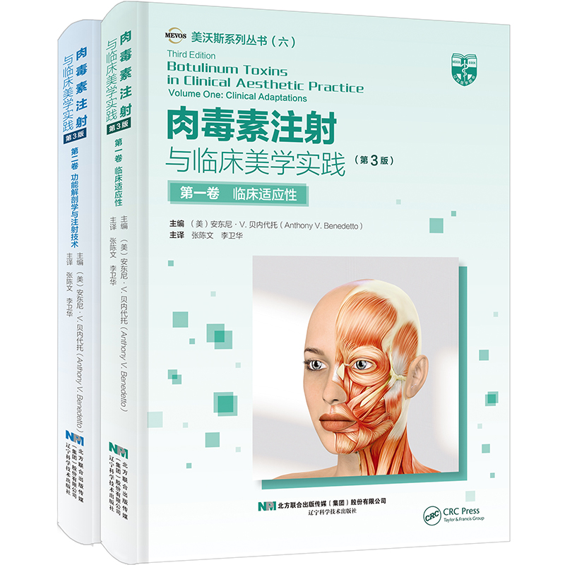 本書原書名《 Botulinum Toxins In Clinical Aesthetic 》,分為上下兩冊。重點介紹了解剖學知識和肉毒素的配比、注射和注意事項,包括肉毒素及其在臨床醫學中的發展、肉毒素:藥理學、免疫學以及發展現狀、非複合肉毒素的藥理學和免疫學、局部應用肉毒素、不同的肉毒素及其在西方的臨床應用、可供臨床使用的來自世界各地的不同肉毒素、肉毒素結合其他注射劑和儀器用於美容:肉毒素用於美容優化、肉毒素治療局灶性多汗症、A 型肉毒素在抑鬱症、雷諾現象和其它新型皮膚病治療中的應用、用肉毒素注射進行美容治療的醫學法律思考、不同西方國家肉毒素給藥不同共識報告的比較、面部功能解剖學、美容比例和神經調節、A 型肉毒素在上面部美容中的應用、A 型肉毒素在中面部美容中的應用、A 型肉毒素在下面部、頸部和上胸部美容中的應用、肉毒素在胸部的應用、亞洲人的肉毒素美容應用、面部表情肌肉、OnaBTX-A 的製備、處理、儲存和注射方式、患者治療記錄、肉毒素治療面部和身體皺紋的知情同意、肉毒素注射的副作用及禁忌證等內容,對注射醫師提高自己的操作技能有很大幫助。