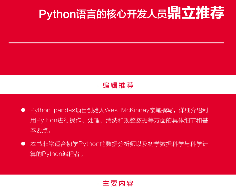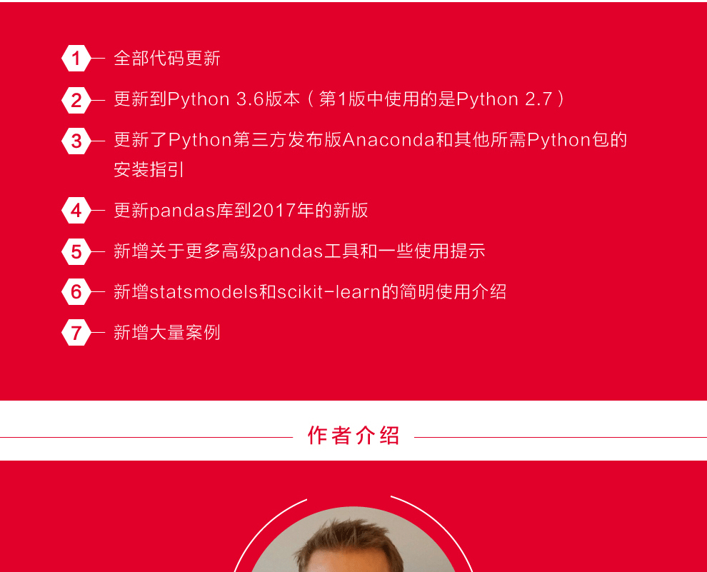 閱讀本書可以獲得關於在Python下操作、處理、清洗、規整數據集的完整說明。本書第2版針對Python3.6進行了更新,並增加了實際案例向你展示如何高效地解決一系列數據分析問題。你將在閱讀過程中學習到新版本的pandas、NumPy、IPython和Jupyter。