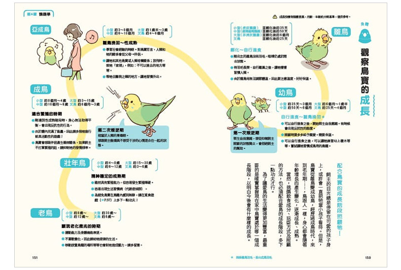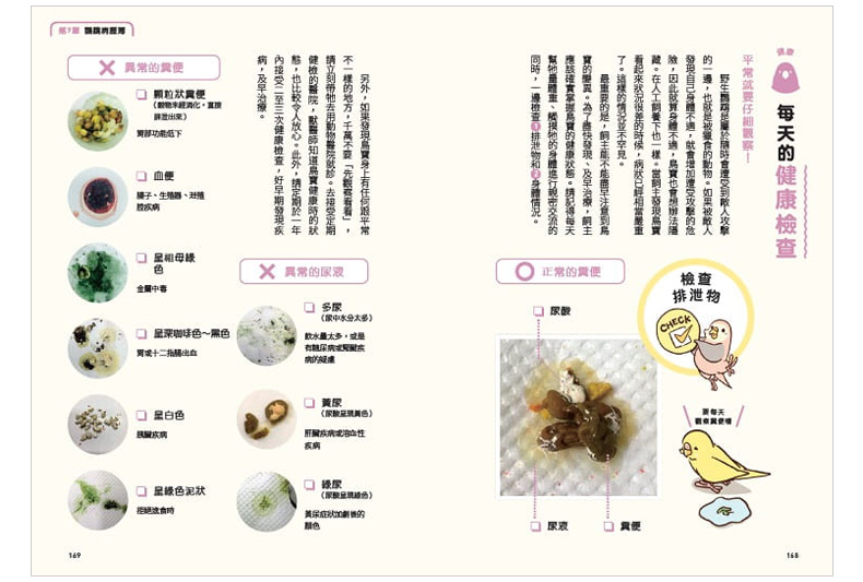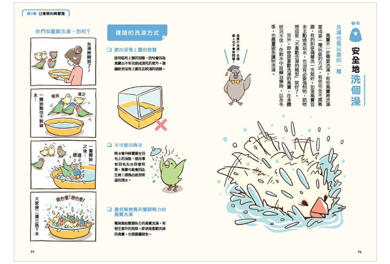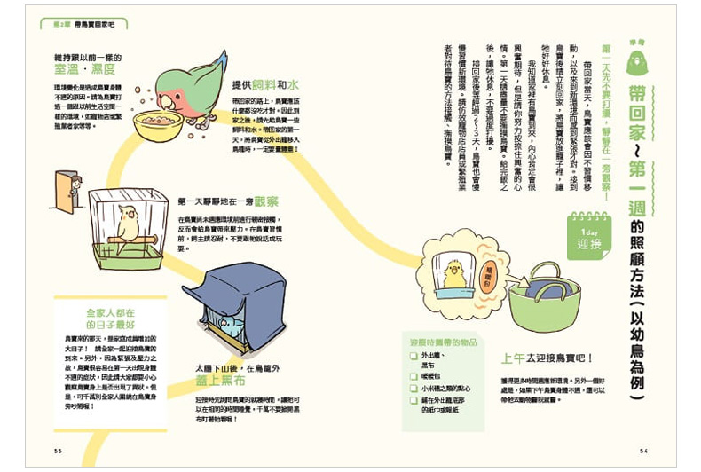 日常照料:每天的飲食、打掃鳥籠、幫鳥寶洗澡或日光浴的方法、修整趾甲等。