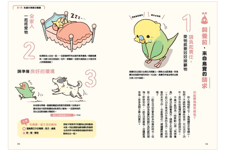 有別於照片或全文字的解說,可愛的「全彩圖解」讓飼育情境完整,飼主能更好領略。
