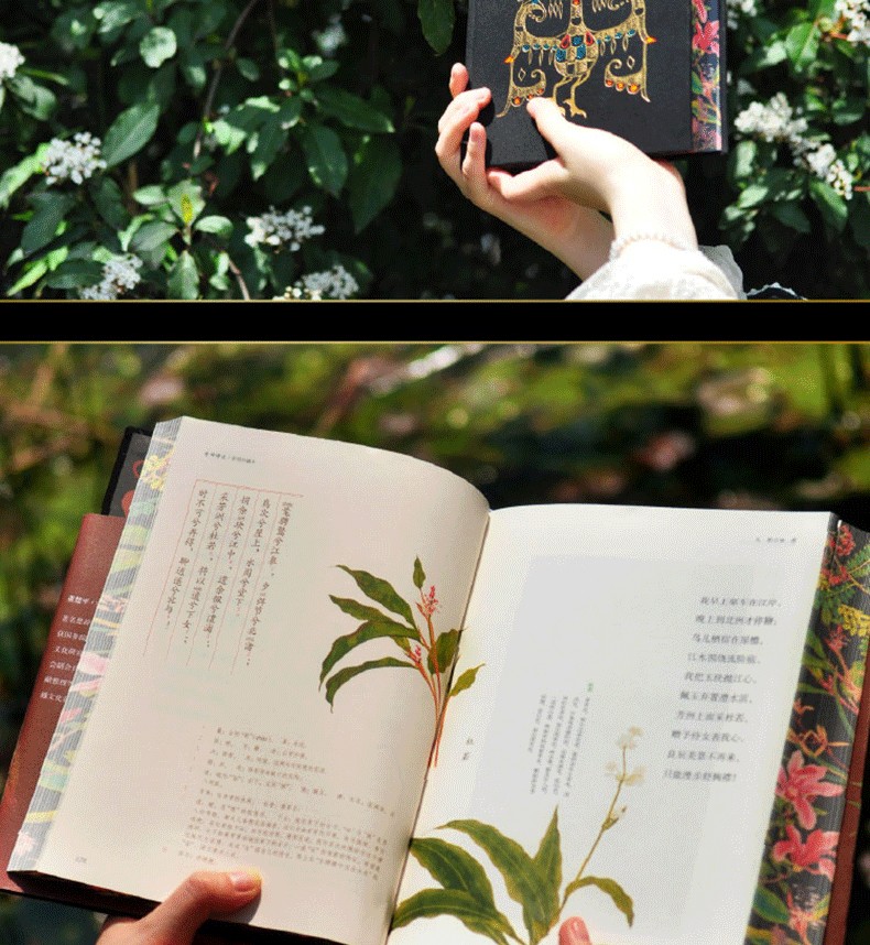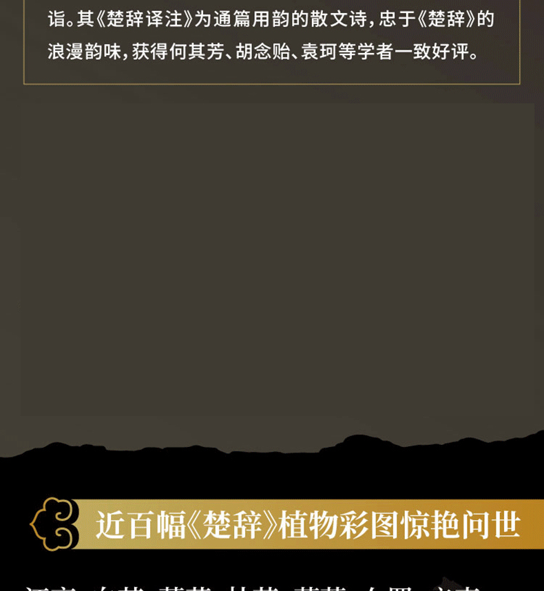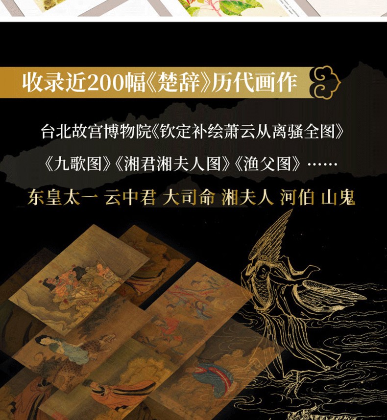 本次出版《楚辭譯註(彩圖珍藏本)》,包括前言、題解、原文、譯文、註釋、注音、彩圖、圖釋、屈原行跡圖、附錄十大版塊,全彩印刷。舊版一些失韻、誤譯的文字進行了修訂潤飾。收錄《欽定補繪蕭雲從離騷全圖》《九歌圖》《湘君湘夫人圖》《漁父圖》《龍舟競渡圖》等楚辭歷代彩圖250餘幅,其中近100幅江戶時代楚辭植物彩圖為首次整理面世,杜若、蘭芷、江離、辛夷、杜衡、薜荔、女羅、菌桂等楚辭草木躍然紙上,帶領讀者揭開「香草美人」的神秘面紗。另收錄《楚辭地理總圖》《抽思、思美人路圖》《哀郢路圖》《涉江路圖》《漁父、懷沙路圖》5幅屈原行跡圖,書末附《屈原列傳》全文譯註及董楚平先生考據名篇《騷離首八句考釋》。全書共有2000多條註釋,對神話與史實、典故與詞義都有詳盡的考釋,生僻字上方標註拼音,董楚平先生的譯詩為通篇用韻的散文詩,忠於楚辭獨有的浪漫韻味,是楚辭入門的上佳讀本。
