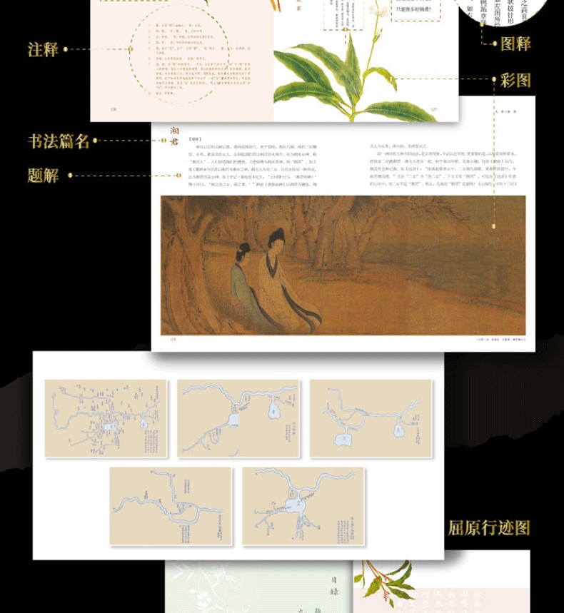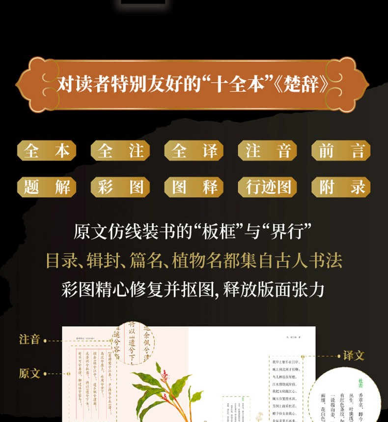 原文,全譯,全註,前言,題解,注音,彩圖,圖釋,屈原行跡圖,附錄-十大版塊,圖文並茂,幫助讀者全方位讀懂楚辭