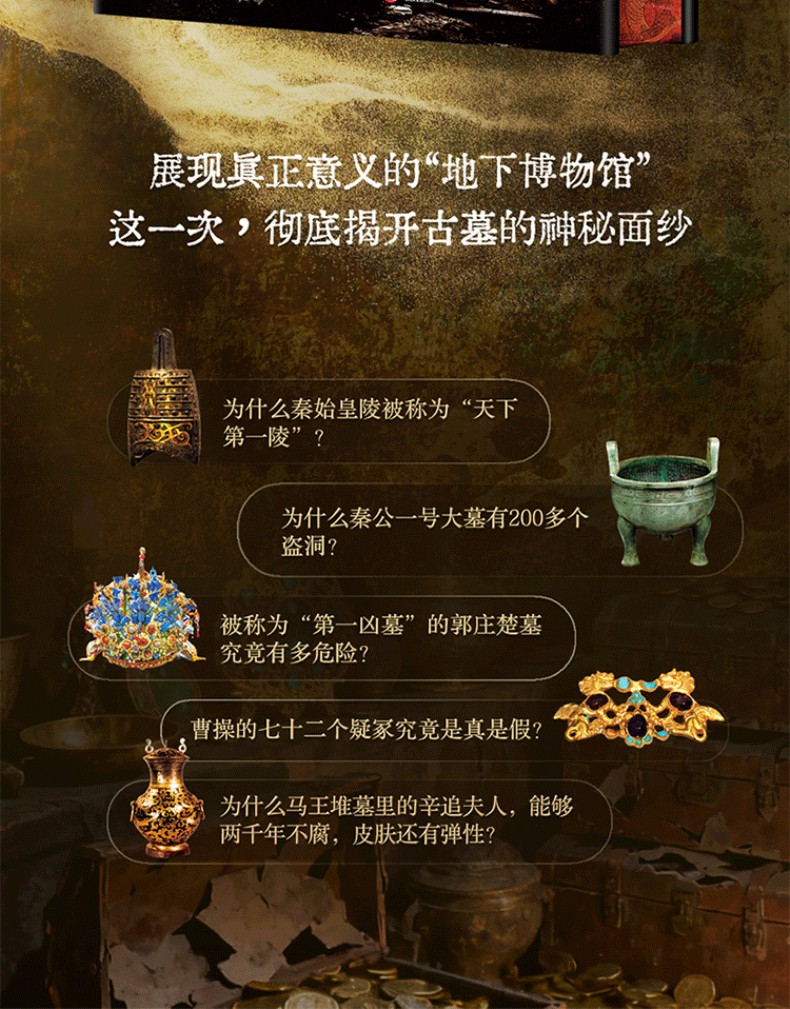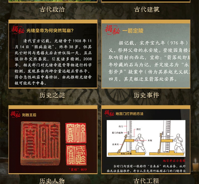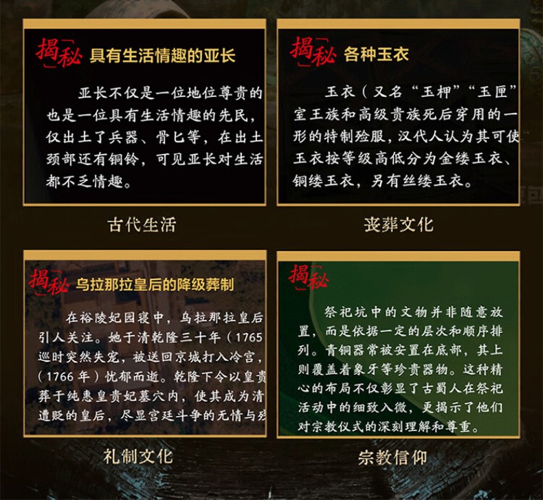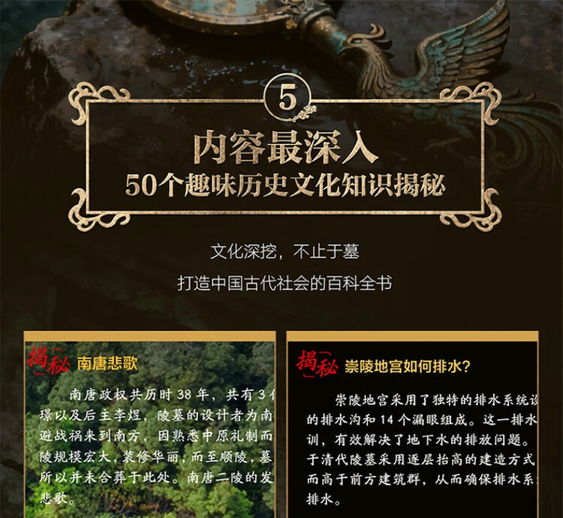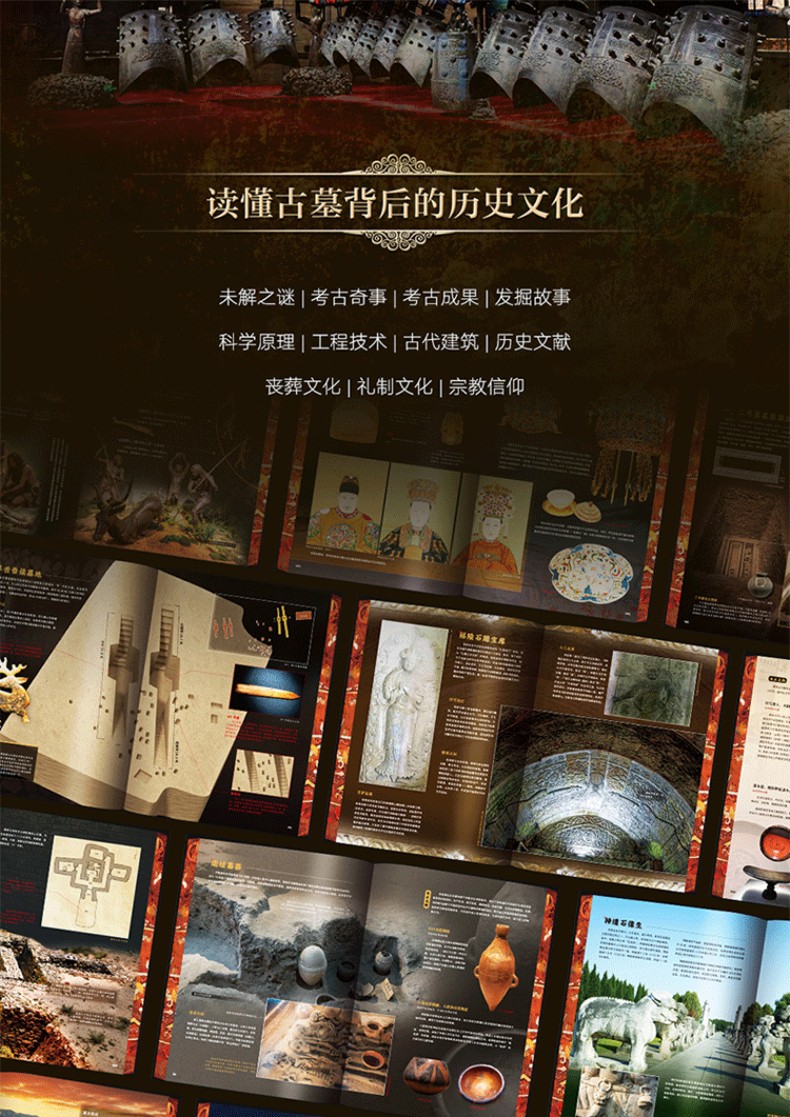 5. 50個趣味歷史文化趣味知識揭秘:對每座古墓進行文化深挖,揭秘背後的社會文化、古代政治、歷史事件、歷史人物、歷史文獻、古代建築、古代工程、古代生活、禮製文化、宗教信仰、發掘故事、考古奇事、考古成果、科學原理、未解之謎,如同一部關於中國古代社會的百科全書。