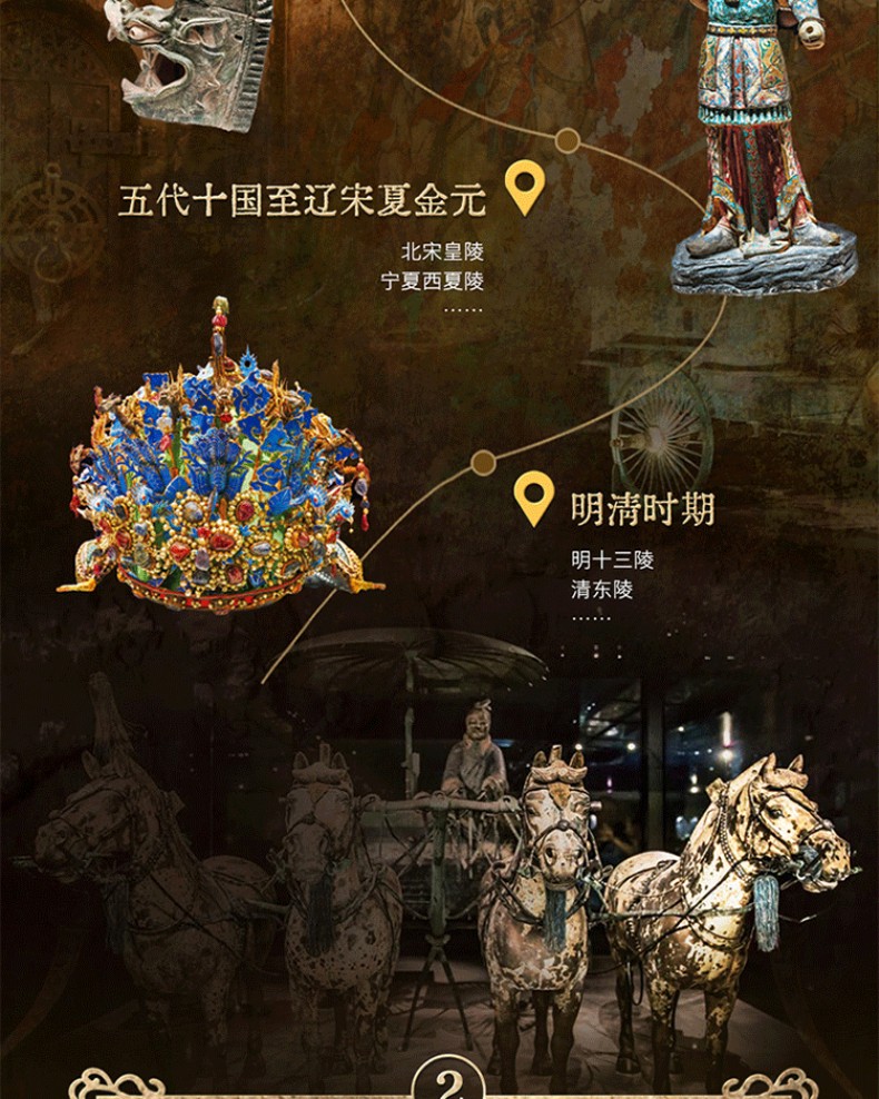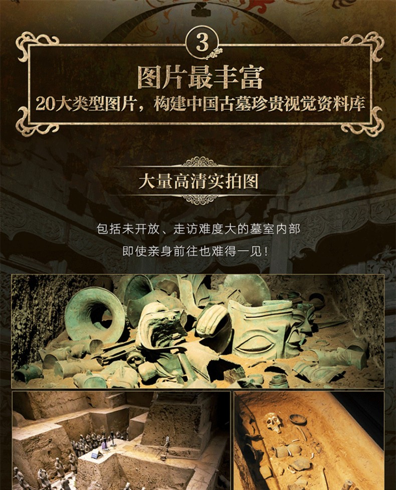 1. 縱貫3萬年中國陵墓遺址發展歷程。從舊石器時期北京周口店遺址至清西陵,包含7大歷史時期,縱貫3萬年歷史,系統講述123座陵墓遺址,清晰展現中國古墓完整發展脈絡。