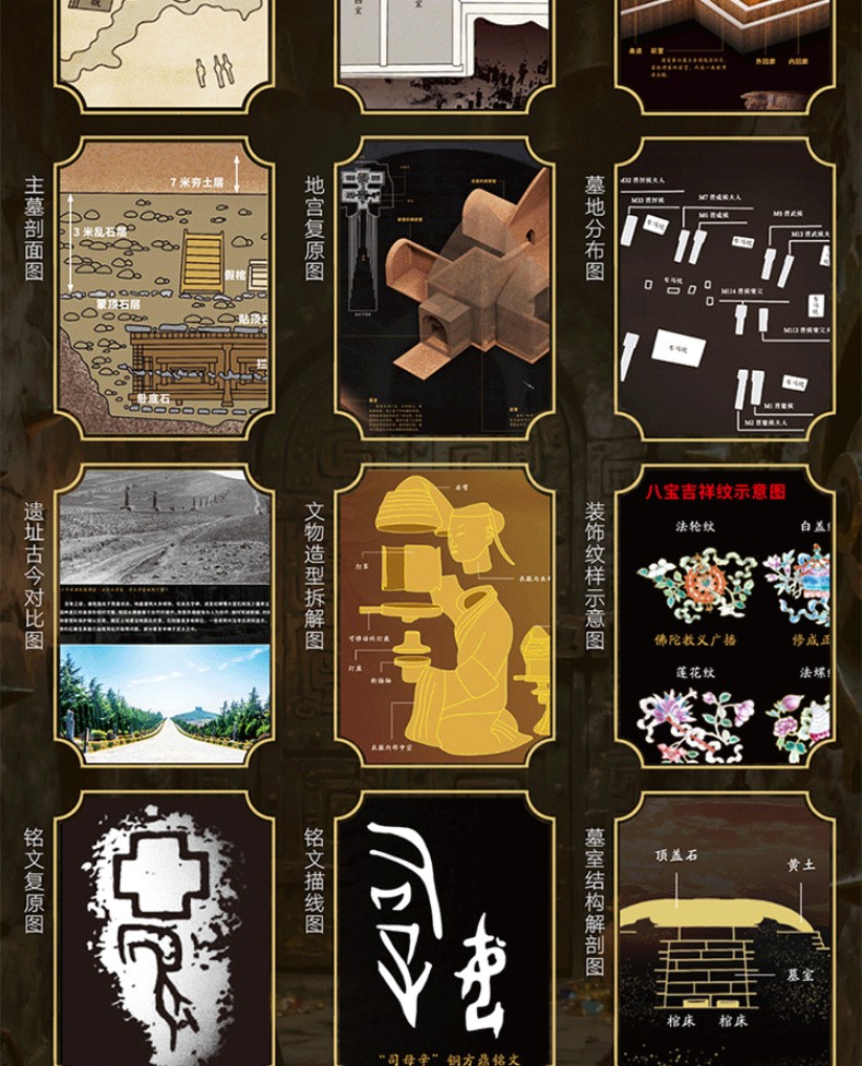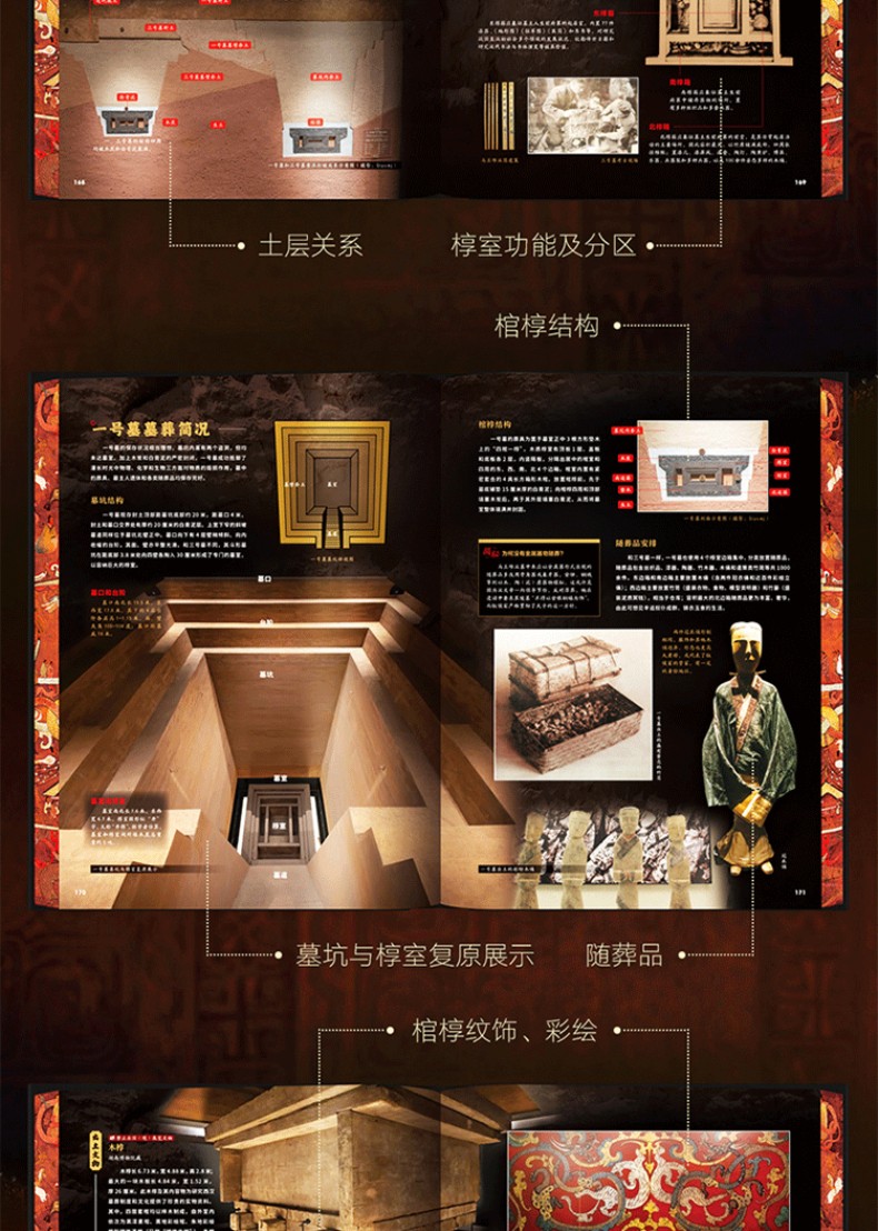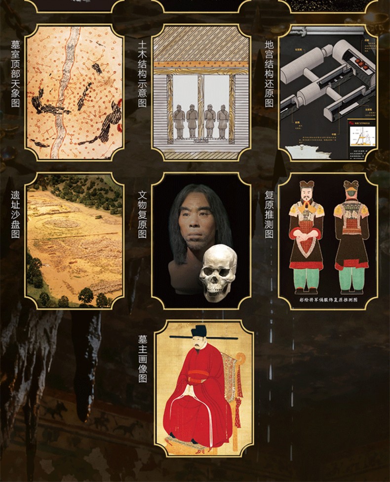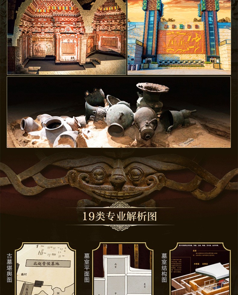 3. 包含罕見高清實拍圖與19類專業解析圖。全書包含大量高清實拍圖,尤其是未開放、走訪難度高的墓室內部,即使親自前往,也難得一見。特別增加19類專業解析圖,包括古墓堪輿圖、墓室平面圖、墓室結構圖、土墓剖面圖、地宮復原圖、墓地分佈圖、遺址古今對比圖、文物造型拆解圖、裝飾紋樣示意圖、紋樣復原圖、銘文描線圖、墓室結構解剖圖墓室頂部天象圖、土木結構示意圖、地宮結構還原圖、遺址沙盤圖、文物復原圖、復原推測圖、古代繪畫,對每座古墓進行360°全面剖析。