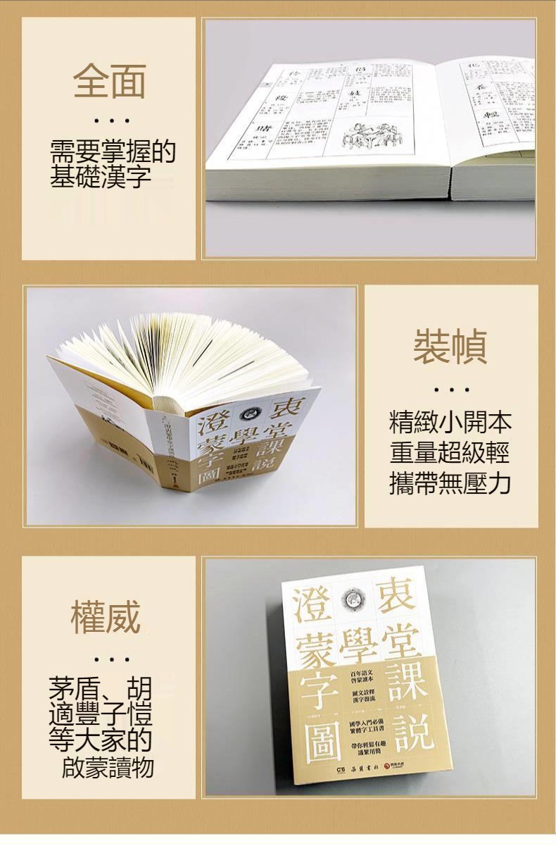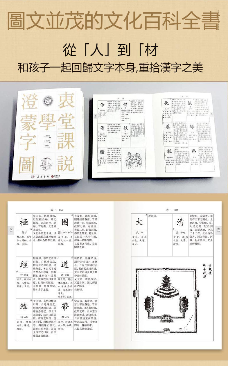 中國文字,字字有德性,字字有靈性。小到一個“天”字、一個“人”字,也許就包含著古人的哲學觀、生命觀,中國幾千年的很好文化正藴藏在這些精美的文字之中。 《澄衷蒙學堂字課圖說》為清末學校識字教材,由劉樹屏編撰,清代畫匠吳子城繪圖,收常用字3300餘個,圖760餘幅,由淺入深、妙趣橫生,從圖像開始探索漢字的奧秘,涵蓋天文地理、鳥獸蟲魚、詩書禮儀、數理化學。本書共四卷,以詞性為類,每字皆有註音、釋義,分簡說和詳說兩欄,以適應不同年齡層次的學子。為方便讀者檢索查閱,本次出版為每字新增現代注音,並附對應簡體漢字拼音索引。許多人將之喻為“插圖版的《說文解字》”,作為民國一代文化大師胡適、豐子愷、茅盾、梁漱溟等大家的啟蒙課本,影響了一代代語文課本編寫的“近現代中華文化百科全書”,是國學入門繞不開的一本啟蒙經典。