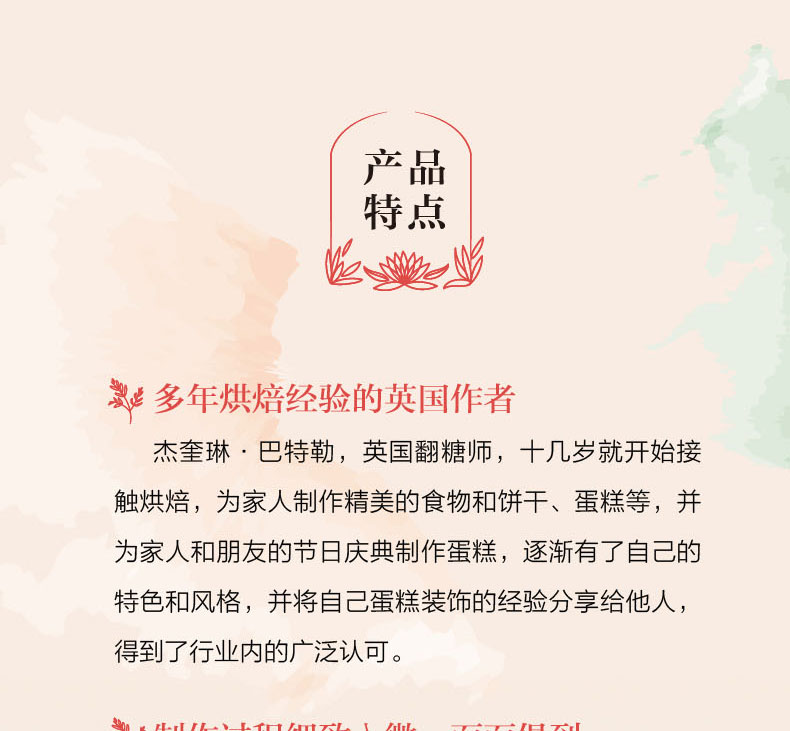 糖花作為翻糖的一個門類,以其逼真、美觀的表現形態,成為蛋糕裝飾推薦的方法與技巧。本書以介紹糖花製作的工具、糖花的製作技巧以及實際案例為主,以超多步驟圖的形式展示了幾十種糖花的製作方法,從基礎的配色、製作講起,按照由易到難的順序,層層遞進,難度逐漸加深,從製作單一花朵開始,到製作花束,再到各種花的搭配和組合。還將婚禮蛋糕等特定場合使用的蛋糕的設計,作為一個單獨的主題來講述,非常實用。本書圖片精美,風格清新,製作過程詳細,可作為蛋糕裝飾的工具書使用。作者簡介